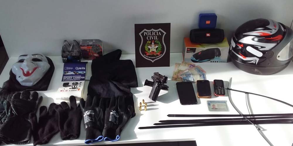 Um jovem de 26 anos foi preso em casa na comunidade de Rio dos Anjos na manhã desta quarta-feira, dia 2. Conforme o delegado Rafael Marin Iasco, o mandado de prisão temporária foi requisitado devido a suspeita de ser um dos autores do roubo em uma loja de celulares no último mês em Vila Nova. Na residência foram encontrados produtos eletrônicos, além de uma pistola 380 municiada que havia sido furtada de uma empresa de caça e pesca na cidade e outros itens utilizados para roubos. O rapaz foi encaminhado ao Presídio Santa Augusta, em Criciúma.
