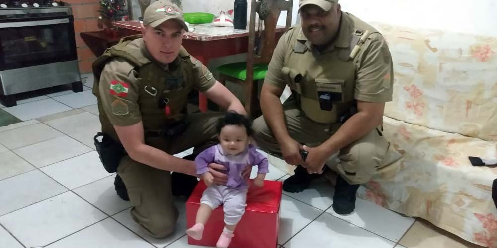 A família da pequena Kauane foi surpreendida novamente por policiais militares da Guarnição Especial de Içara nesta sexta-feira, dia 13. O primeiro contato havia ocorrido na madrugada do dia 9 de dezembro com um pedido de socorro na Rua Rio de Janeiro, em Balneário Rincão. Foi quando o soldado Júlio e o cabo Rafael realizaram os procedimentos emergenciais para desafogar a menina de apenas oito meses, naquele momento, engasgada com o leite. Mas a ajuda dos militares foi além. Ao verem a necessidade da bebezinha, se juntaram para comprar fraldas e alimentos para o retorno nesta última noite.