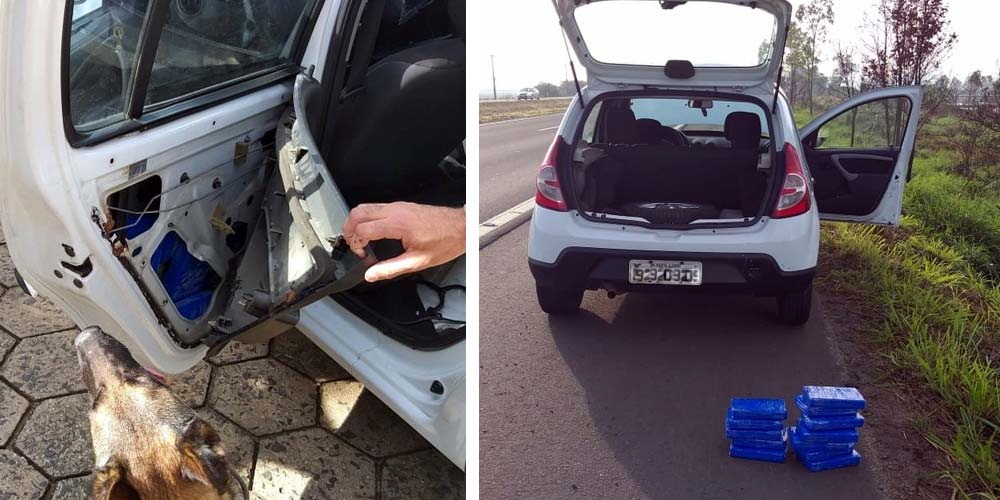 Conforme divulgado pela PRF, os agentes visualizaram um Sandero de Porto Alegre (RS) parado próximo à rodovia com defeito mecânico. Durante a vistoria ao interior do veículo, desconfiaram de marcas de desmonte na região do porta-luvas. Ao abrir a peça, encontraram no interior do painel então os tabletes da droga.