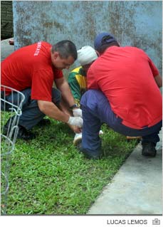 Visivelmente embriagado e atordoado pela impacto que sofreu ao cair na Rodoviária Municipal, um homem foi recolhido pelo Corpo de Bombeiros de Içara na tarde desta segunda-feira, dia 29. A queda ocorreu logo que se levantou de uma cadeira em frente aos ônibus. Ensanguentado, foi então deslocado ao lado do prédio público para os primeiros socorros. Já em seguida, por volta das 13h30, acabou removido para atendimento médico com um corte na cabeça encoberto por faixa.