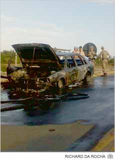 Uma lataria preta, com plástico e borracha derretida onde deveria haver painéis e pneus, além de bancos transformados em cinzas. Isto foi o que sobrou de um Santana que transitava pelo Acesso Sul na tarde deste domingo, dia 16. Por volta das 17h10, o veículo seguia em direção a BR-101 e foi tomado pelo fogo em frente ao Bali Hai. Acionado, o Corpo de Bombeiros de Içara teve como missão então controlar as chamas no momento de pico no tráfego do local. Ao todo, foram utilizados 3 mil litros de água. Ninguém se feriu.