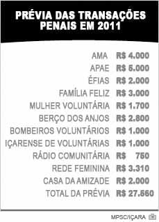O valor recebido por entidades com transações penais aplicadas na Comarca de Içara já soma R$ 27,5 mil somente em 2011. Ao todo, são 11 instituições beneficiadas. Todas terão uma mesma quantia do bolo. A diferença é que o pagamento não ocorre simultaneamente. Para a Associação de Pais e Amigos dos Excepcionais, por exemplo, foram depositados R$ 5 mil. Enquanto isso, a Associação Içarense de Voluntárias obteve R$ 1 mil até agora.