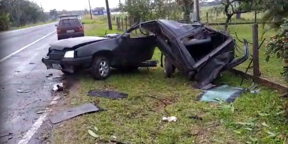 Carro colidiu contra um poste e partiu ao meio na Rodovia Paulino Búrigo (SC-445)