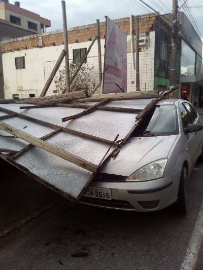 Vento derruba outdoor sobre veículo no Centro de Içara