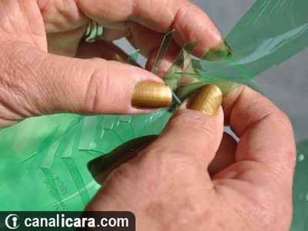 - Corte a base de cada uma delas e na maior parte da embalagem, faça tiras até o afunilamento da boca;